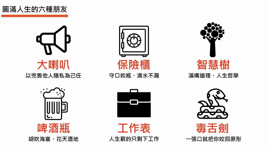 借用Adam的老師的文章,人生大概會有六種朋友,沒有遇到你的生命真的會有遺憾…六個角色不會衝突,有些人就會重複很多角色。