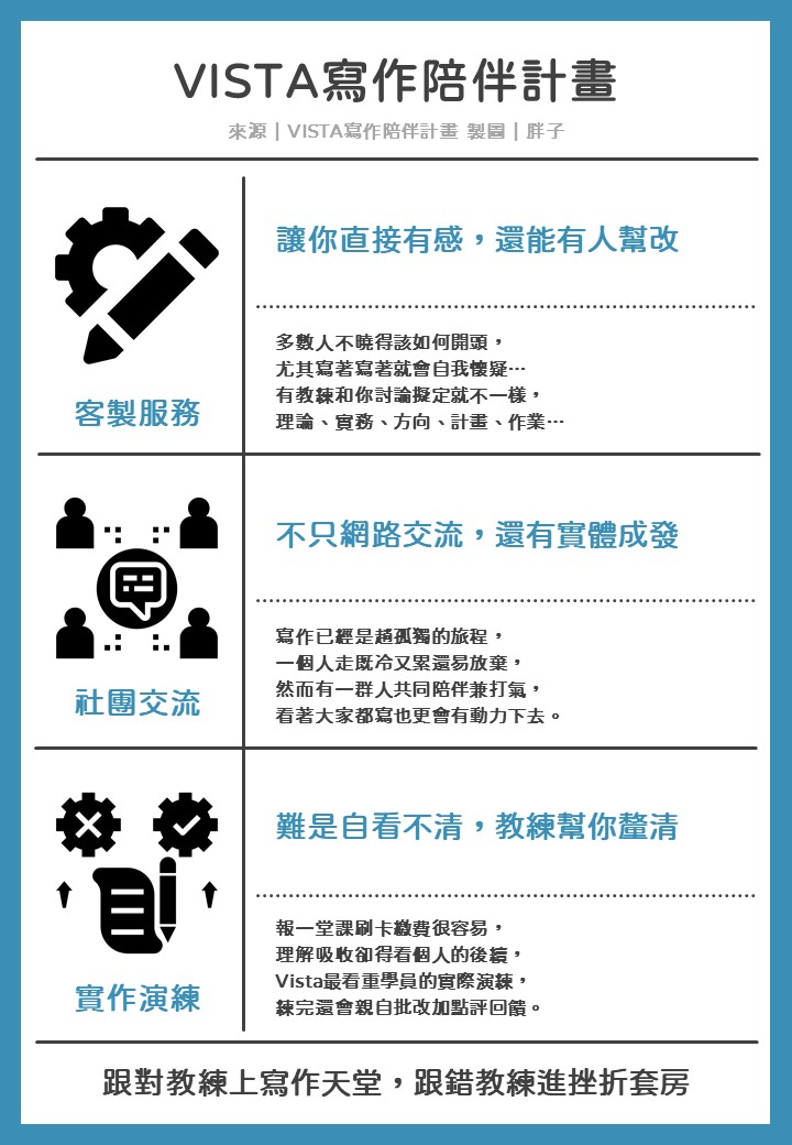我就推薦教練型的【Vista寫作陪伴計畫】,寫作那麼多人在教,以下是我推薦Vista的三個理由: